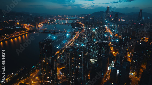 Smart digital Innovation city with connection network reciprocity over the cityscape. of future smart wireless digital city and social media networking systems that connects people with in city