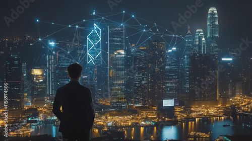 Smart digital Innovation city with connection network reciprocity over the cityscape. of future smart wireless digital city and social media networking systems that connects people with in city