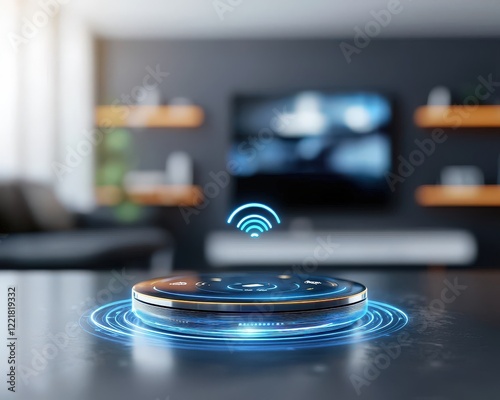 Smart home control holograms floating in a living room.