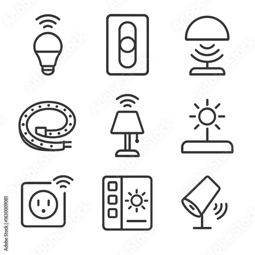 Smart Lighting Icons. Outline icon set of smart lighting control: smart bulb, dimmer switch, motion sensor, color LED strip, smart
