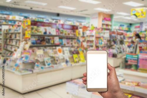 Smart phone white screen in hand on blurred background
