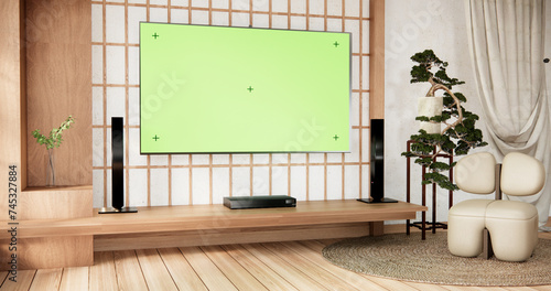 Smart Tv Mockup with blank green screen hanging in modern white empty room interior minimal designs.