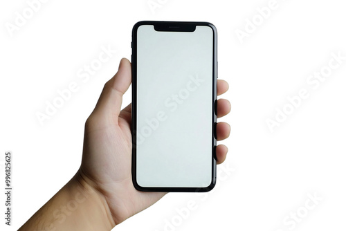 Smartphone Mockup with Blank Screen Held in Hand, Isolated Mobile Device for App Display and Digital Technology, Perfect for Tech Designs and Mobile Templates