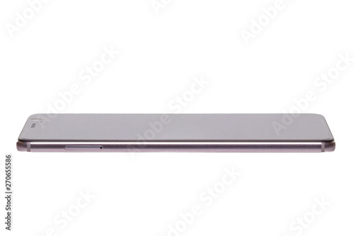 Smartphone technology background. Closeup of mobile smart phone with extra thin design isolated on a white background. Macro.