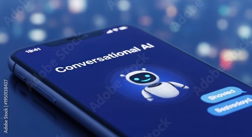 Smartphone with conversational artificial intelligence chatbot interface with friendly robot avatar, for modern digital communication, automated customer support, advanced machine learning