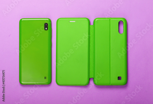 Smartphone with green leather protective case on pink background