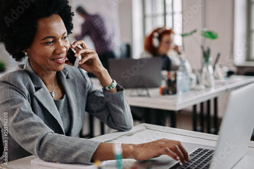 Smiling African America businesswoman using laptop while talking on cell phone in the office.