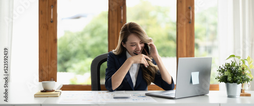 Smiling asian business woman at work talking on phone and taking notes, sitting at her working place in office, copy space. banner.