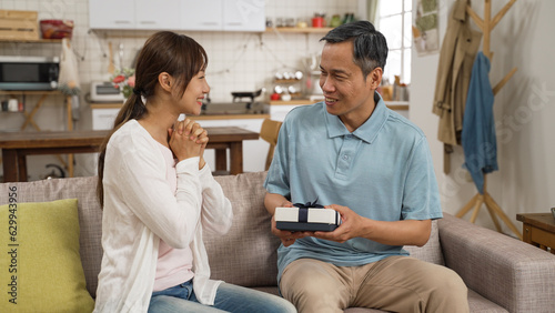 smiling asian daughter giving happy father a surprise present for Father’s Day celebration at home. she removes hand from his eyes and hopes he likes the gift
