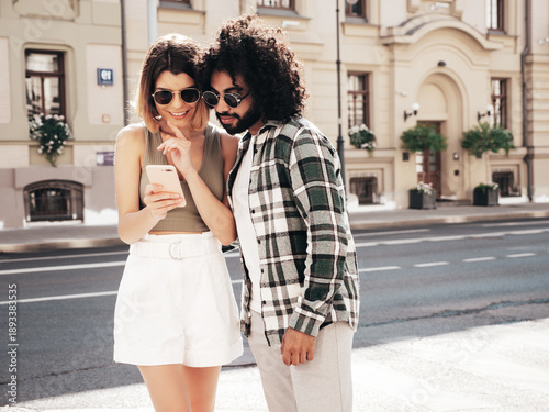 Smiling beautiful woman and her handsome boyfriend. Happy cheerful family. Woman having fun. Sexy couple posing in the street at sunny day. Using smartphone apps, looking at cellphone screen