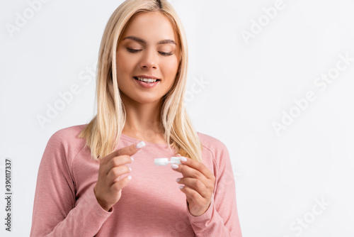 Smiling blonde woman holding container with contact lenses on blurred foreground isolated on grey