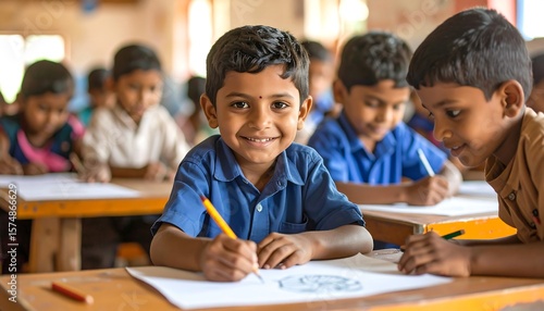 Smiling boy drawing in classroom