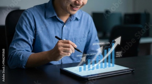 Smiling businessman analyzing financial growth, digital marketing strategy, and business success. Data visualization, technology, and investment concept.