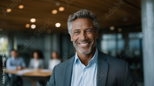 Smiling businessman standing at the head of a conference table, confidently leading a meeting with his team in a modern office business leadership, team meeting, office collaborati