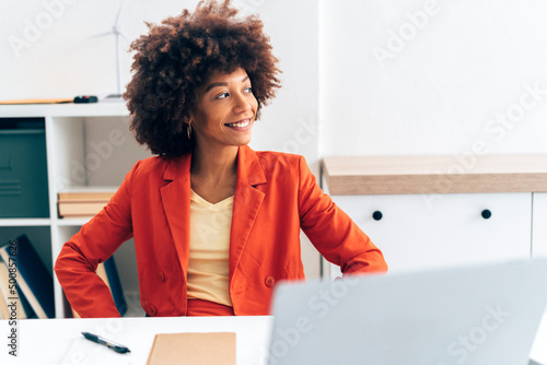 Smiling businesswoman with laptop sitting at desk in office
