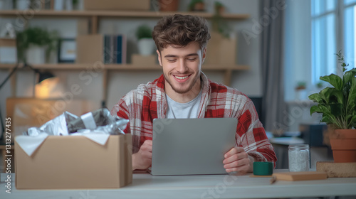 Smiling Caucasian male e-commerce owner packing orders at home workspace