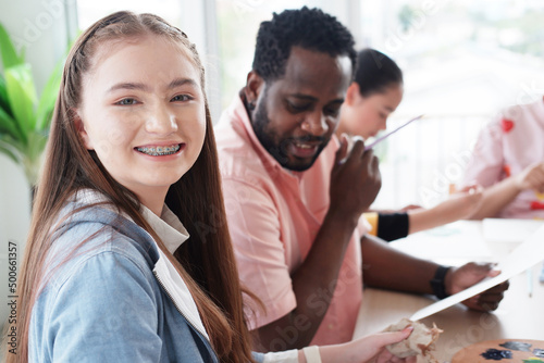 Smiling Caucasian studens girl is holding paintbrush for drawing and painting with watercolor for art with African teacher man in classroom at international school. Education for artist Concept.