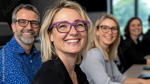 Smiling colleagues collaborate at a modern office