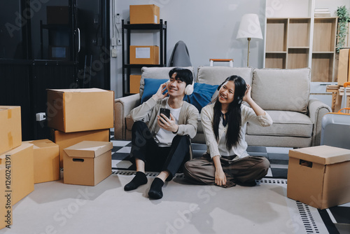Smiling couple unpacking boxes in new house