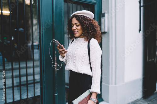 Smiling dark skinned trendy dressed female walking on city street holding mobile phone choosing playlist music, positive african american woman meloman satisfied with sound quality for radio