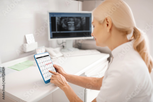 Smiling dentist looking at her plans in calendar.
