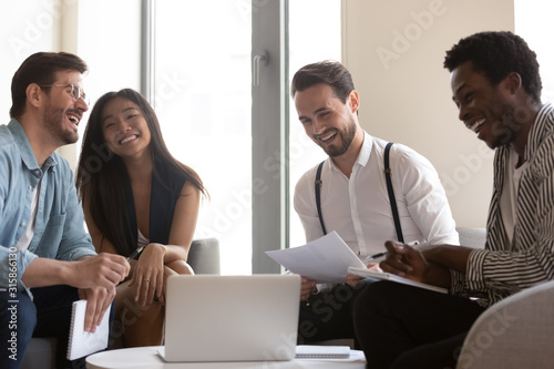Smiling diverse colleagues laugh cooperating at briefing in office