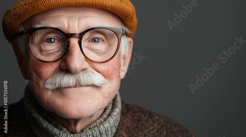 Smiling Elderly Man with Glasses and Mustache on Neutral Background