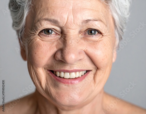 Smiling elderly woman with short gray hair and gentle wrinkles, against a gray backdrop