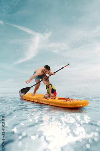 Smiling father paddles with his child daughter sitting on orange sup board over calm water under clear blue sky. Composite image, collage. Concept of sport, active lifestyle, vacation, summer activity