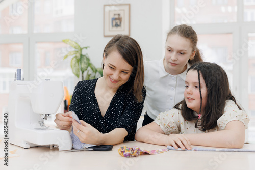Smiling female designer or seamstress talking with children, education work. Dressmaker conducts sewing master class in school for two girl child