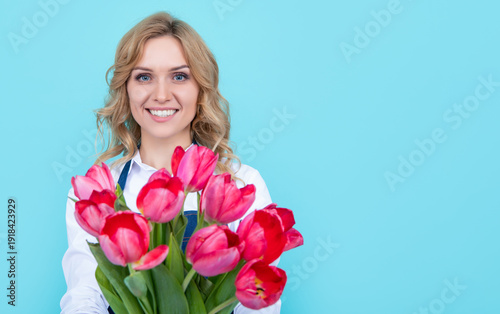 smiling girl in apron with spring tulip flowers on blue background