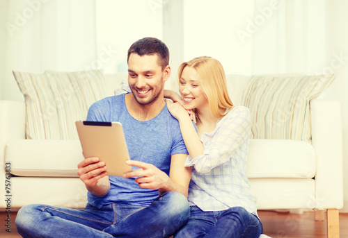 smiling happy couple with tablet pc at home