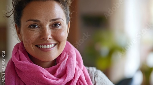 Smiling hispanic female adult wearing pink scarf indoors