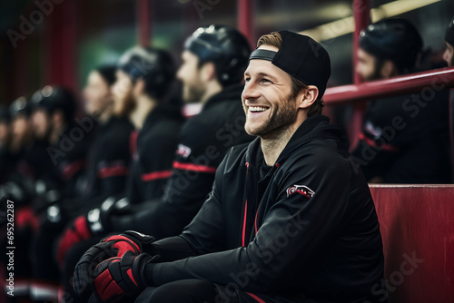 Smiling hockey player on the stands of a hockey stadium