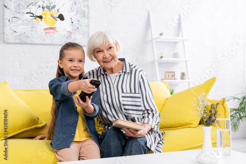 Smiling kid holding remote controller near granny with book on couch