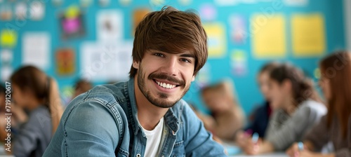 Smiling male teacher in classroom with elementary school students looking at camera