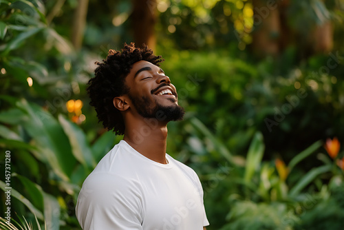Smiling man amidst lush greenery, enjoying nature's embrace. Peaceful and serene atmosphere, with warm light adding to the tranquility.