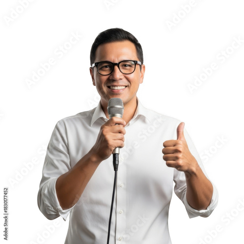 Smiling man holding microphone isolated on transparent background isolated on transparent background indoor, outdoor, no people, keyword 30