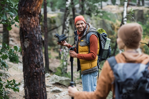 smiling man holding vintage camera and looking at woman trekking in forest on blurred foreground