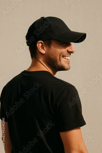 Smiling man in black t-shirt and cap, looking to the right. Stylish casual wear for everyday, showcasing confident and relaxed vibes.