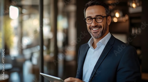 Smiling Man in Suit Holding Tablet, Indoor Setting