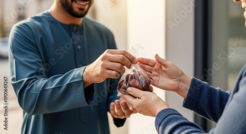 Smiling man in traditional attire hands a small plastic bag of fruit to another person outdoors