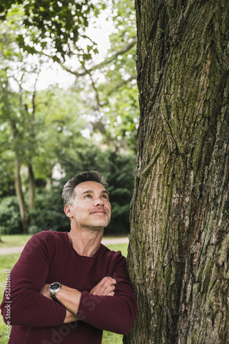 Smiling man with arms crossed leaning on tree trunk