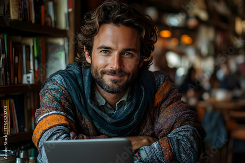 Smiling Man Working On Laptop In Cozy Cafe