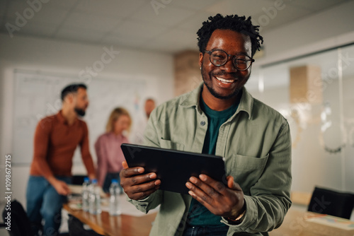 Smiling manager using digital tablet during office meeting