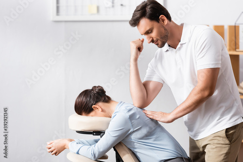 Smiling masseur massaging businesswoman back with elbow in office on blurred background