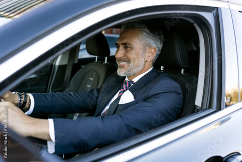 Smiling mature businessman driving car