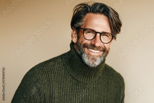 Smiling mature man with glasses and beard wearing a green turtleneck sweater.