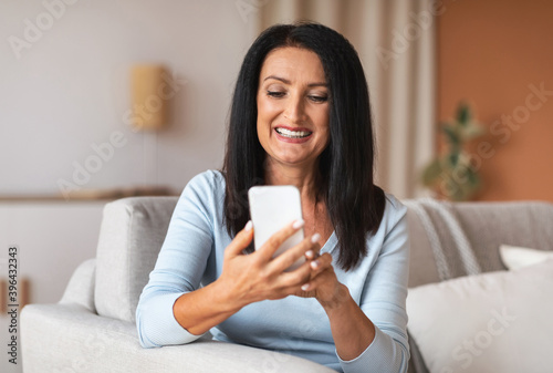 Smiling mature woman using smartphone at her home