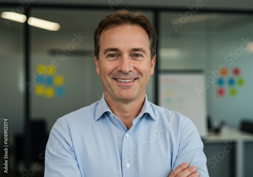 Smiling middle aged man with arms crossed wearing light blue collared shirt in modern office environment